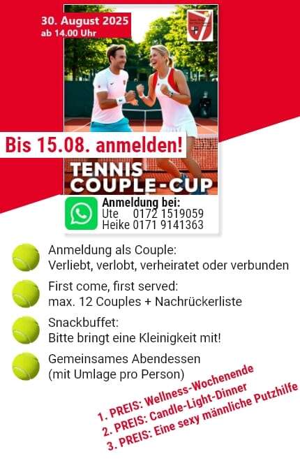 Heike und Ute, die Siegerinnen des letzten Jahres, organisierten einen wunderschönen Tag mit vier spannenden Runden Tennis und drei weiteren Wettbewerben – darunter ein Bobby-Car-Rennen, ein Hula-Hoop-Contest und ein Luftballonlauf. Die Mischung aus sportlichem Ehrgeiz und Spaß sorgte dafür, dass alle Spielerinnen und Spieler beim diesjährigen Couple Cup glänzen konnten.